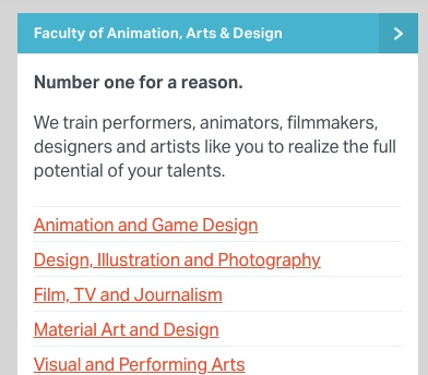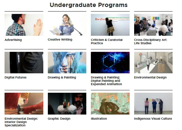 目前,本科设有广告、创意写作、批判与文化实践、跨学科:艺术生活研究、数字未来、绘画、环境设计、平面设计、插画、原住民视觉文化、工业设计、集成媒体、材料艺术与设计、摄影、印刷与出版、雕塑与装置、视觉批判研究等等。