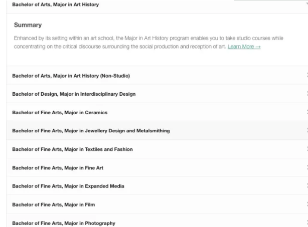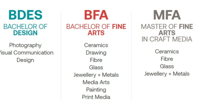 本科学位包括 艺术史、跨学科设计、制陶艺术、电影、珠宝与金工、多媒体、摄影、视觉艺术、平面设计、时尚纺织、纯艺术等专业(下图为英文对照)。