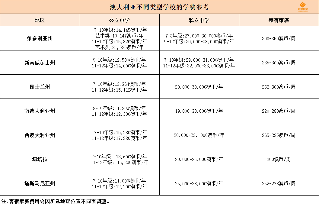 公立学校由政府出资办学,国际留学生的学费约澳币12,000-16,000/年,私立中学的学费则远高于公立中学,属于精英教育。 与国内一些国际学校相比,澳洲中学的学费可能会更低 。可参考下表: