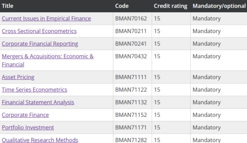 学生通过学习参加相应的课程和其他学业活动,完成课后作业、 Pres entation 、课程论文、考试等获得学分,修满学分才算满足毕业条件。以曼大 AF 授课硕士 的课表为例,大家可以感受一下: