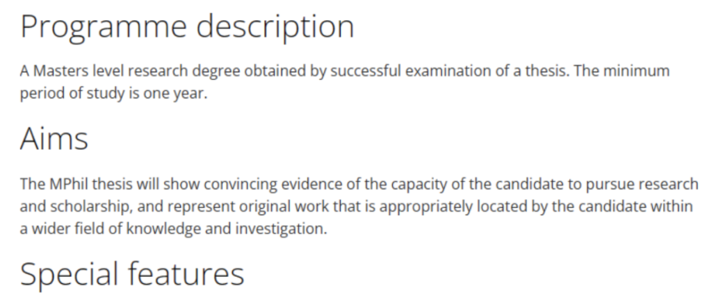 MPhil ( Master of Philosophy )哲学硕士学制大多为两年,课题项目比较广泛。顺利读完 MPhil 的学生可以直接跳入 PhD 的最后一年,但学术要求太高,不太容易。