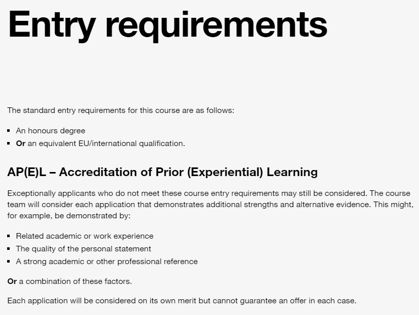 如果想要申请G5这类顶尖名校,光有好的学位等级是远远不够的,因为所有申请者的学位等级都很高,想要提供成功率还得寻找其他的加分项。 申请英国硕士, 大学非常看重工作经验、项目经历 ,有些大学专业愿意降低标准录取有工作经验的学生,例如如果你是应届无经验的学生,学校对你的成绩要求是二等一,如果你有相关专业2年工作经验,那么成绩可以降低到强二等二。 例如 伦敦艺术大学 的 APEL通道 (下图) ,如果申请者证明自己有额外的优势或者有可代为考量的工作学习经验,则有可能会放宽录取要求 破格录取 。