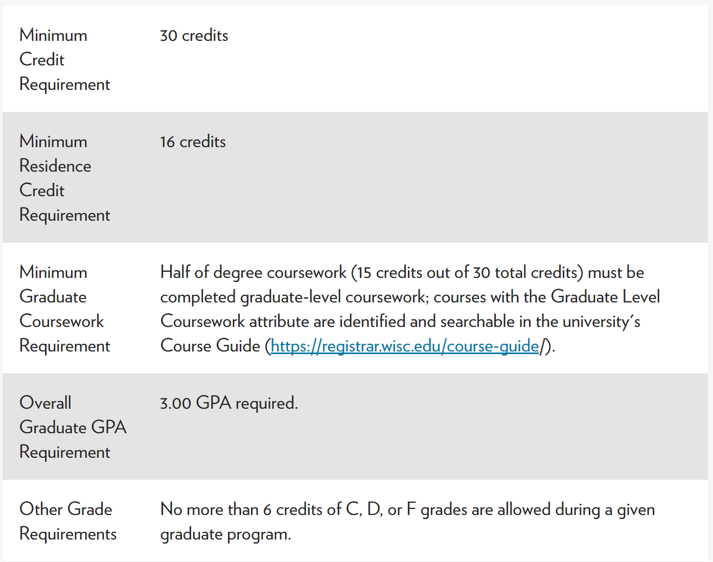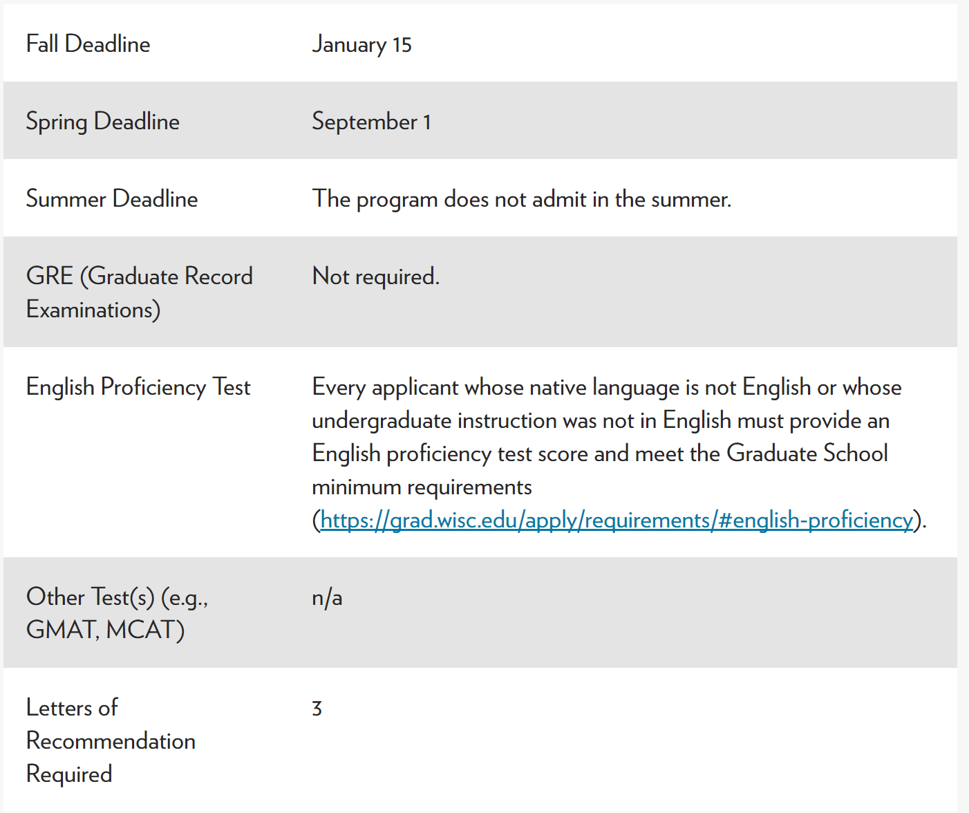 被该项目录取的学生必须满足研究生院的最低要求,包括完成学士学位,通常包括在食品科学、乳制品科学、化学、大多数生物科学(如生物化学、微生物学、营养学)和工程(尤其是化学和农业)等领域接受令人满意的本科教育。要进入该项目,学生必须至少选修一门生物化学课程(例如BIOCHEM 501或BIOCHEM/NUTR SCI 510)和一门有机化学课程(例如CHEM 341、CHEM 343或CHEM 345)。