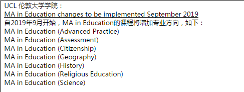 MA in Eucation 课程,继续对教育进行广泛和均衡的研究。 What is Eucation? an Unerstaning Research 以及学位论文将继续作为该课程的必修课。这两个模块和论文 / (研究项目)也将是各专业路线上的学生必修的课程。专业课将集中所有方向的学生来学习必修课 ( 将在秋季和春季继续进行 ) ,必须注意的是,必修课通常是大部分学生都需要上的课程,因此,从某种意义上说,所有教育专业的学生聚集在一起学习这些课程是不会改变的。