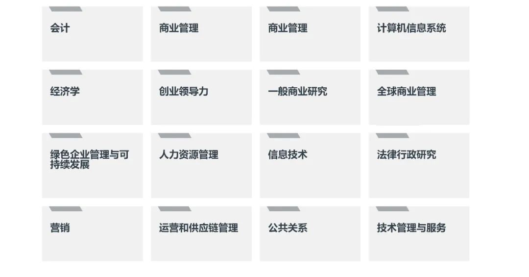 我们的课程提供从传统商学院专业如会计、人力资源、经济、营销等课程,还加入了更多为迎合未来世界所准备的前沿管理学课程,例如我们的绿色企业管理专业等。除了学士专业课程,我们还为大龄人士提供学士后文凭课程以及短期的证书类课程。