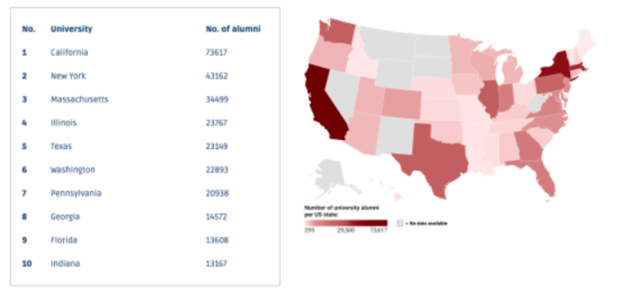 从院校的位置来看,来自美国加州的毕业生更受科技大厂青睐。