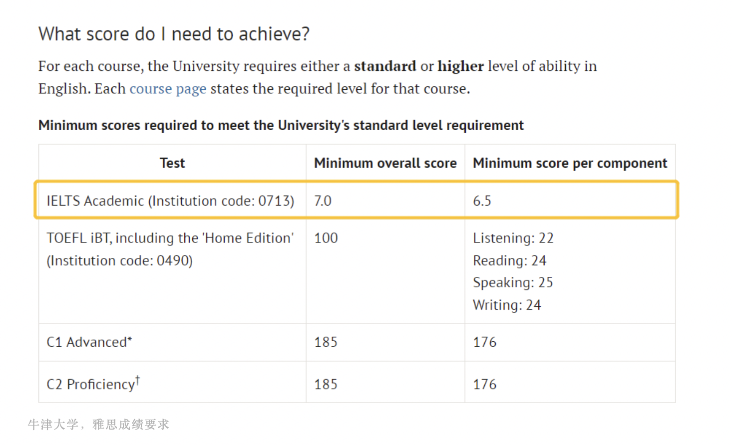 牛津大学本科要求学生雅思成绩 7.0 ,单项不低于6.5;剑桥大学本科 7.5 ,单项不低于7.0;帝国理工Standard 6.5 ,单项不低于6.0;伦敦政经学院整体 7.0 ,单项不低于6.5;UCL分不同级别的成绩,甚至达到了 8.0 (单科8.0)。