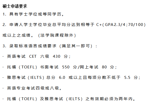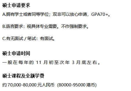 拥有学士或者同等学位。若申请人为往届本科毕业生,申请硕士学位课程则必须参加内地的应届全国研究生招生考试,并且考研初试总成绩必须达到国家A区分数线。
