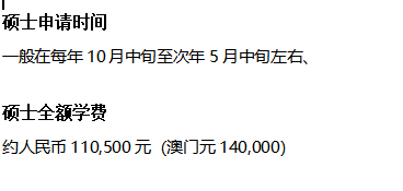 ① 学费:澳门的学费相较于香港、新加坡地区来说比较低,本科4年学费在25万左右;硕士2年学费在10-12万左右。