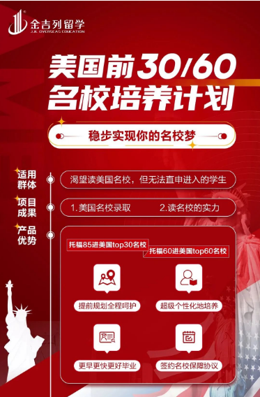 「美国前30/60名校培养计划」是在对美国教育体系以及中国学生的深刻理解的基础上,开创的一条适合大多数中国普通学生的名校升学之路。它立足于美国高等教育中特有的转学体制,为学生提供包括学术、领导力、兴趣、职业、转学等在内的全方位、全过程的「五重服务」,既保证学生获得美国Top30/60名校的录取,又保障其具备顺利完成名校学业的实力。