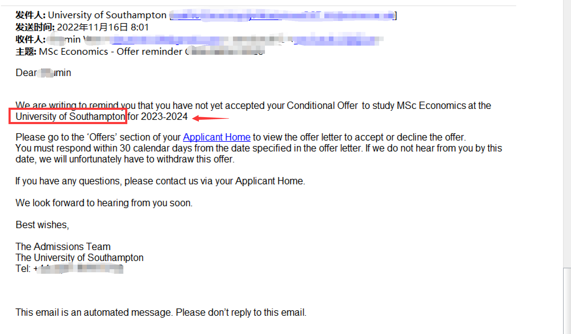 恭喜来自德国的大学的金吉列学员敏同学,收获南安普顿大学(University of Southampton)经济学学硕士(MSc Economics)录取!