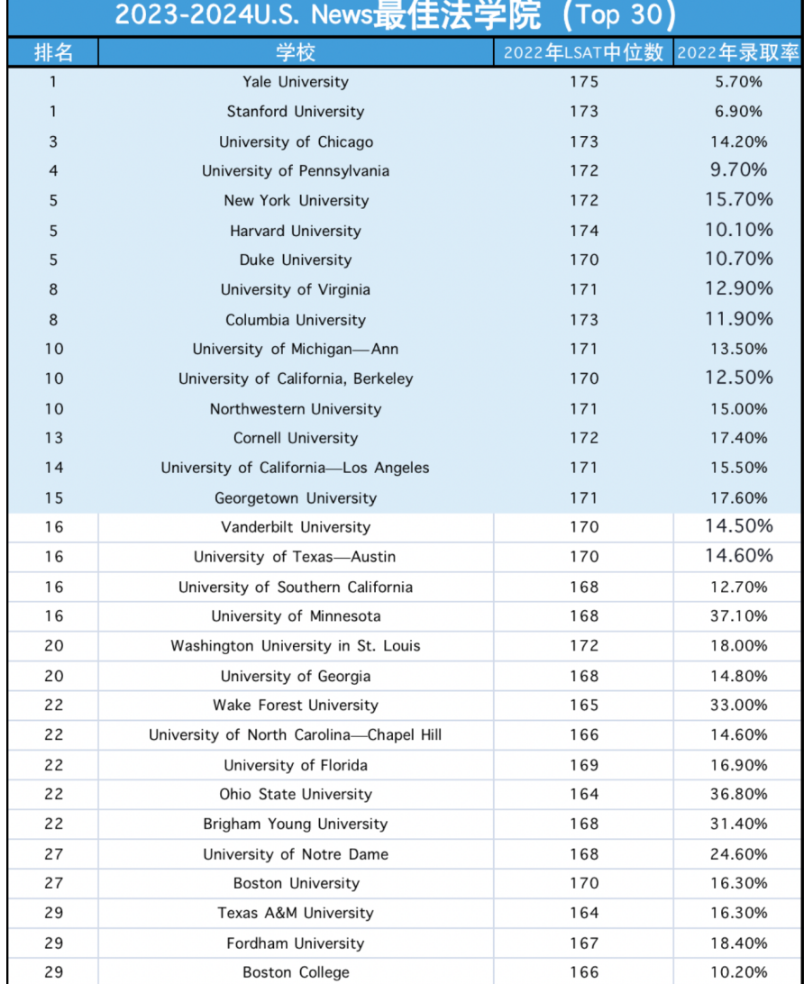 除了前十名之外,还有多所法学院的排名上升。比如维克森林大学法学院从第37名,跃升到了第22名。