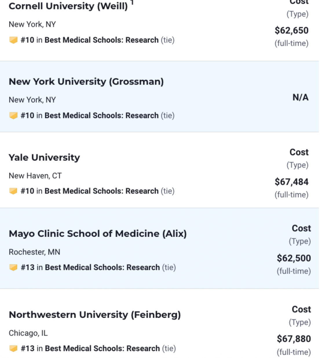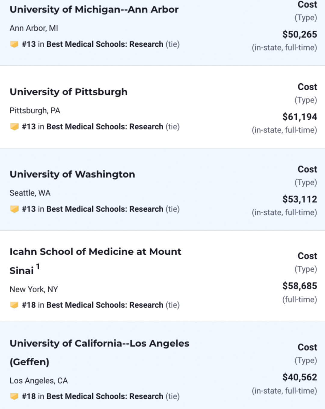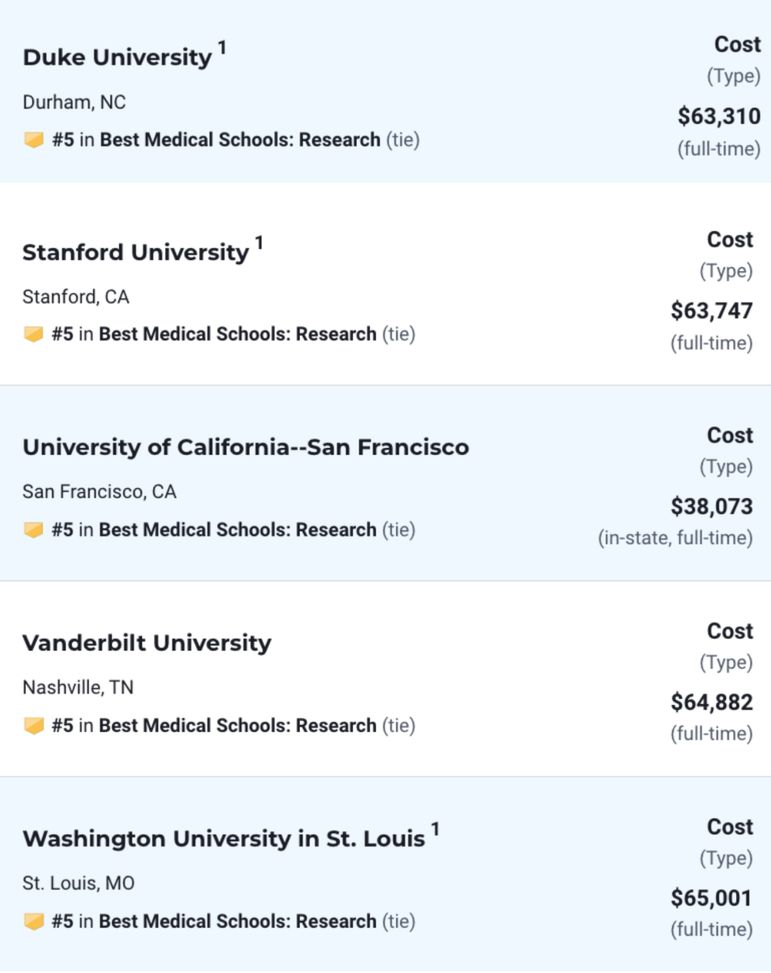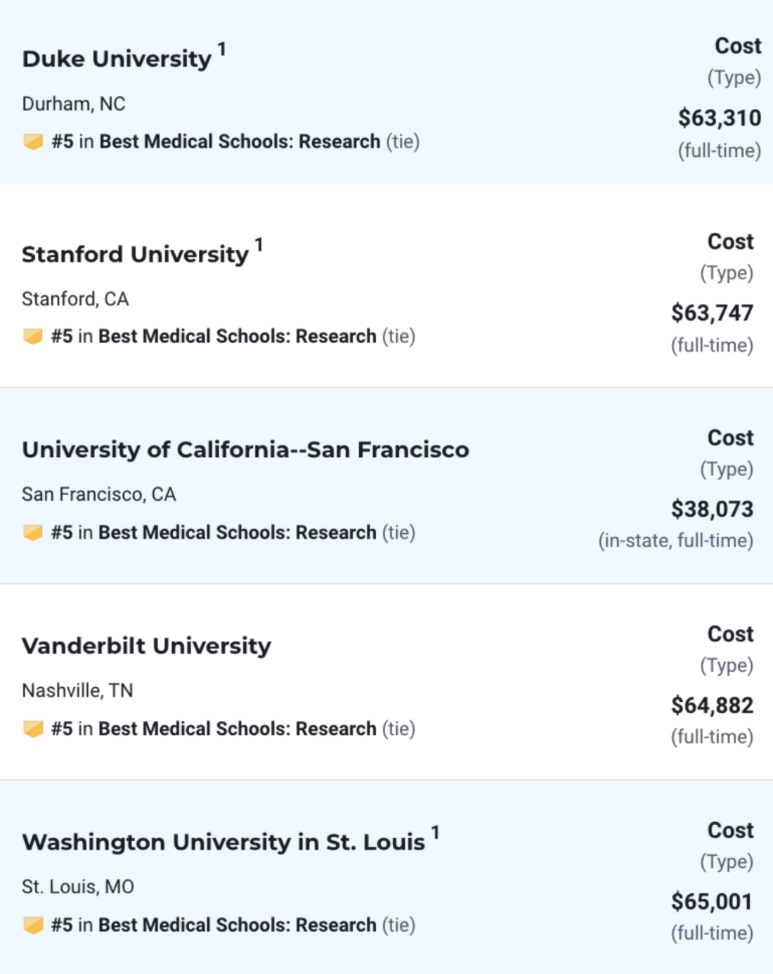 圣路易斯华盛顿大学医学院则从第11闯进了前十,与杜克大学医学院、斯坦福大学医学院、加州大学旧金山分校医学院和范德堡大学医学院并列第5。
