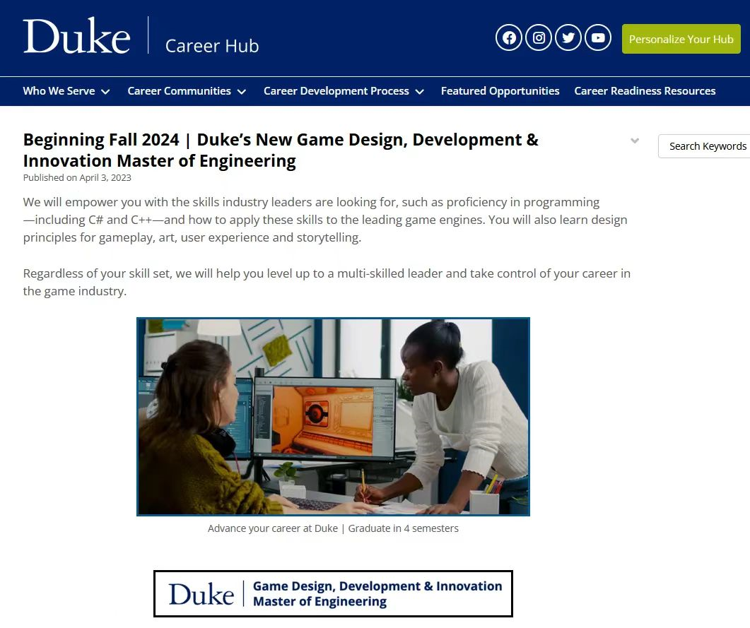 近日,美国名校杜克大学(Duke University)宣布其工程学院推出一个全新硕士项目——游戏设计、开发与创新工程硕士(Master of Engineering in Game Design, Development, and Innovation)。首届入学为2024秋季,预计将于2023年9月左右开放申请。