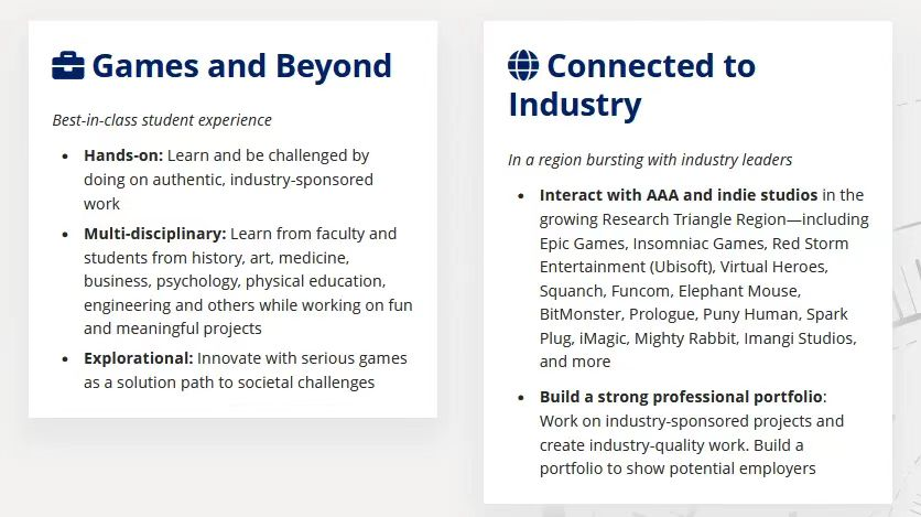 杜克大学的游戏设计、开发和创新工程硕士项目侧重于培训专业人士,使其成为各种规模的游戏公司的游戏开发人员、系统工程师、工具工程师等。除了学习开发世界一流游戏的技能外,该项目的课程还将侧重于游戏理论和技术的更广泛应用,包括企业训练、健身、运动、健康、外科模拟、研究、教育和元宇宙。从本质上讲,游戏设计和开发是一个高度多学科的实践领域。游戏设计、开发和创新工程硕士学位是与行业顾问委员会共同创建的基于技能的实践型课程。学生将通过行业赞助的工作以及课堂和工作室项目、研讨会和指导来发展和掌握新技能。将指导所有学生开发有针对性的ePortfolio,在项目期间展示他们基于技能的学习。