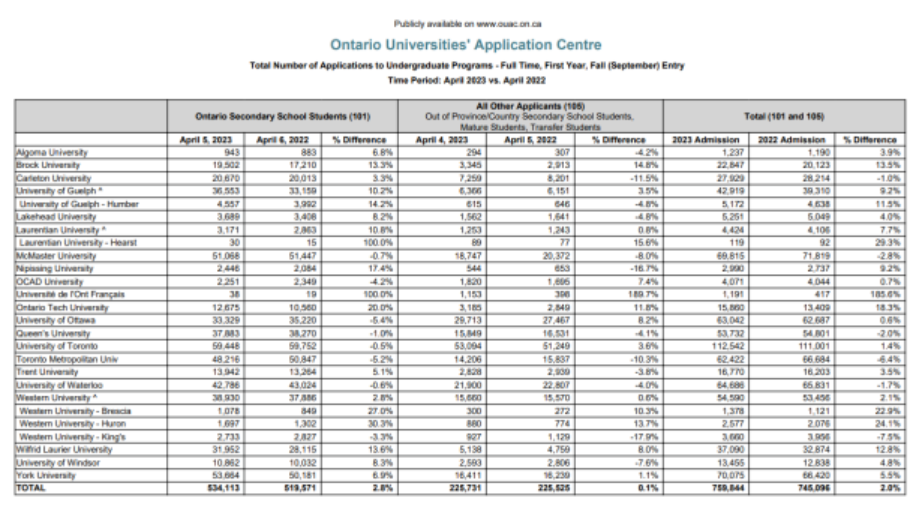 4月12日,安省大学申请中心Ontario Universities’ Application Centre(OUAC)发布了过去十年间,每年四月的 本科申请数据统计 。