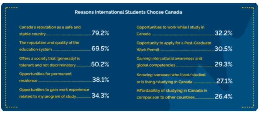 并且从加拿大全国的范围来看,国际生的数量也还是在不断增长的。从2021年到2022年,加拿大的国际学生人数增加了31%。截至2022年底,国际生在过去5年里增长了43%,在过去10年里增长了近170%。不难看出,申请加拿大大学的国际生越来越多了,那么加拿大留学的优势都有哪些呢?CBIE曾在2021年国际学生调查报告中揭示了来自世界各地的国际生选择加拿大的原因。