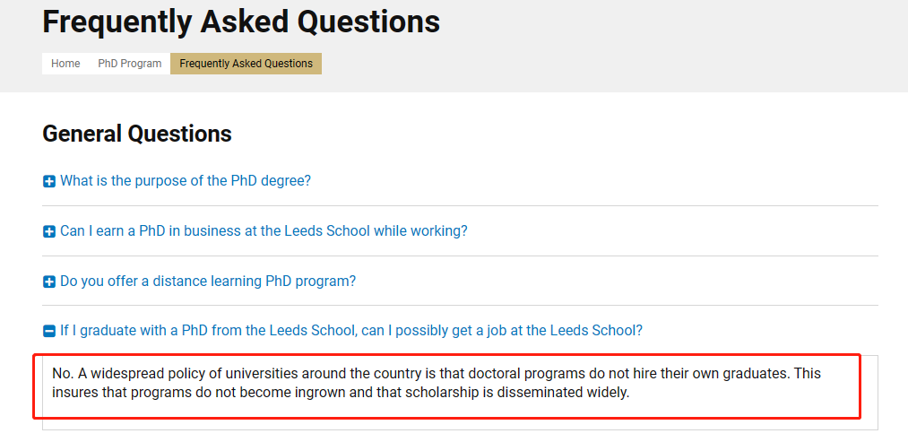 科罗拉多大学博尔德商学院官网针对此问题给出了回答,其表示美国大学的普遍政策是倾向不招收本校毕业的博士生留校任教,这样做可以防止自行其是,也有利于学术成果的推广。
