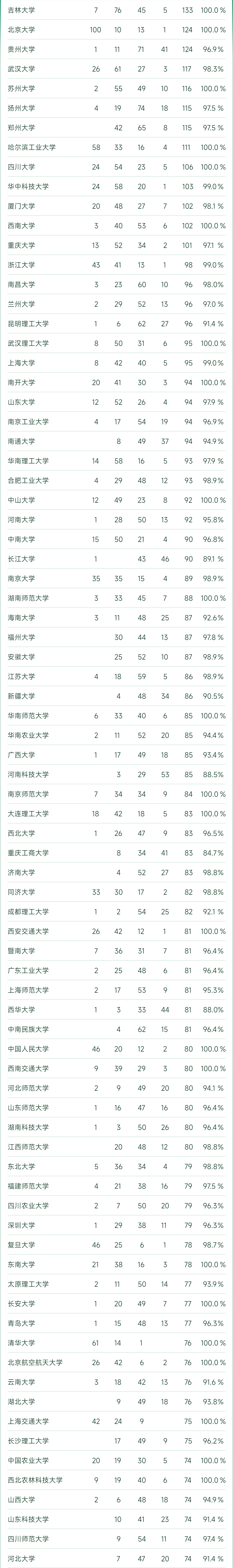 按照上榜专业数统计, 吉林大学 有133个专业上榜,领先国内其它高校; 北京大学 和 贵州大学 则以124个上榜专业并列全国第二。其他上榜专业数超过100个的高校分别为 武汉大学 (117个)、 苏州大学 (116个)、 扬州大学 (115个)、 郑州大学 (115个)、 哈尔滨工业大学 (111个)、 四川大学 (106个)、 华中科技大学 (103个)、 厦门大学 (102个)、 西南大学 (102个)、 重庆大学 (101个)。