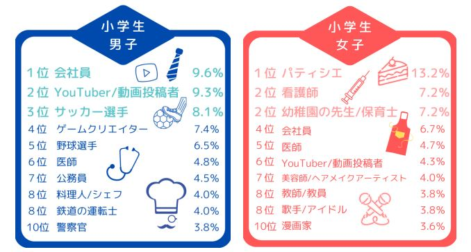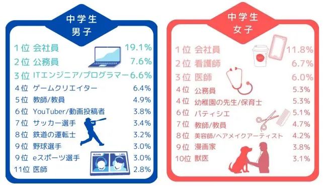 据第一生命称,回答者的父母职业多为公司职员,上述结果可能是因为对该职业比较熟悉。小学男生理想职业的第二位是“YouTube视频博主”,第三位是“足球选手”;小学女生第二位是“漫画家和插画师”,第三位是“公司职员”。