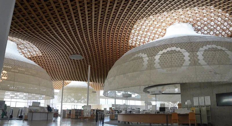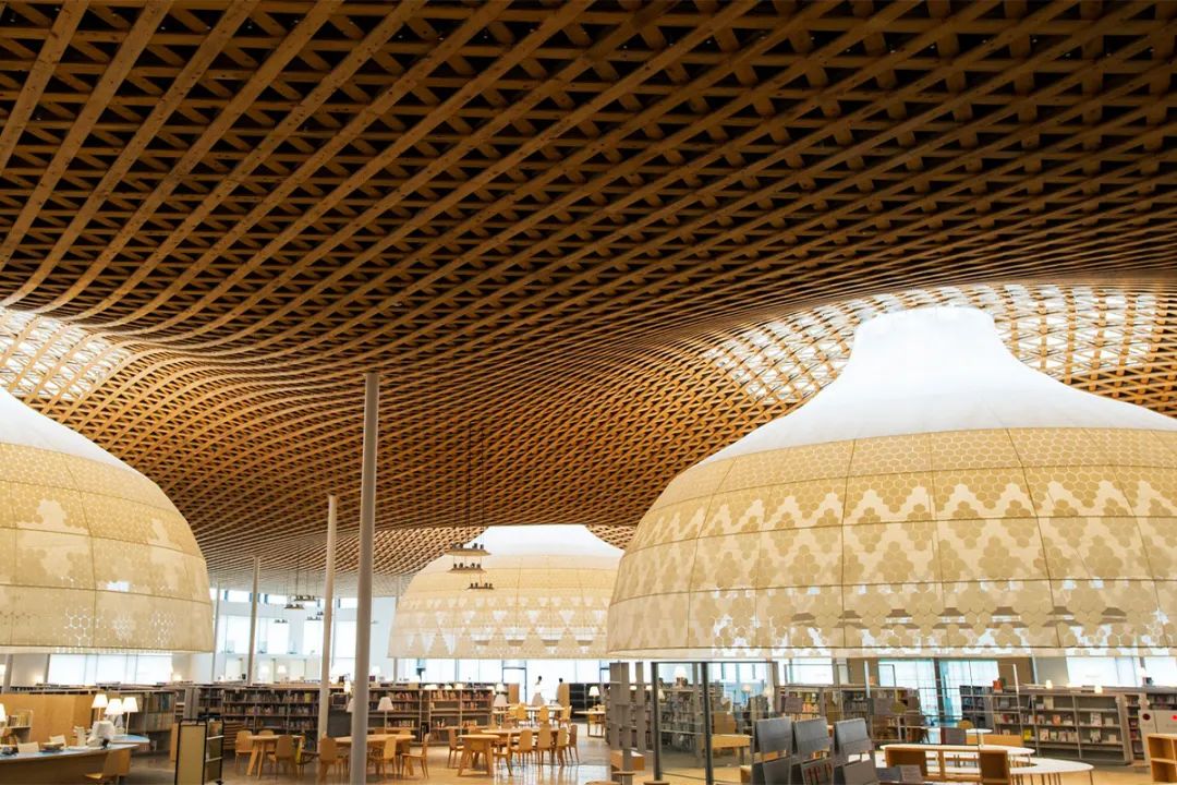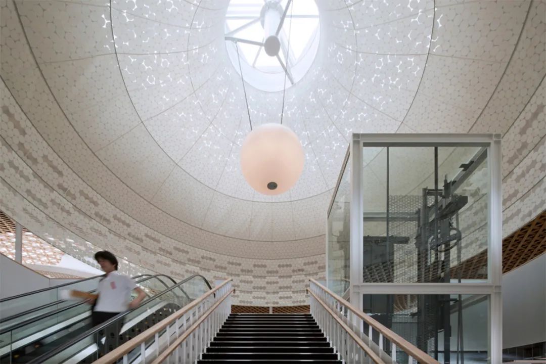馆内的装饰风格更是令人眼前一亮,天花板上东浓桧木纵横交错,如同海浪般此起彼伏,富有动感,又诠释出“森林”的概念。11个巨大的、有着漂亮纹理的半透明“半球”自天花板上垂下,大小不等,且花纹各不相同,设计极富想象力,形态极为惊艳。