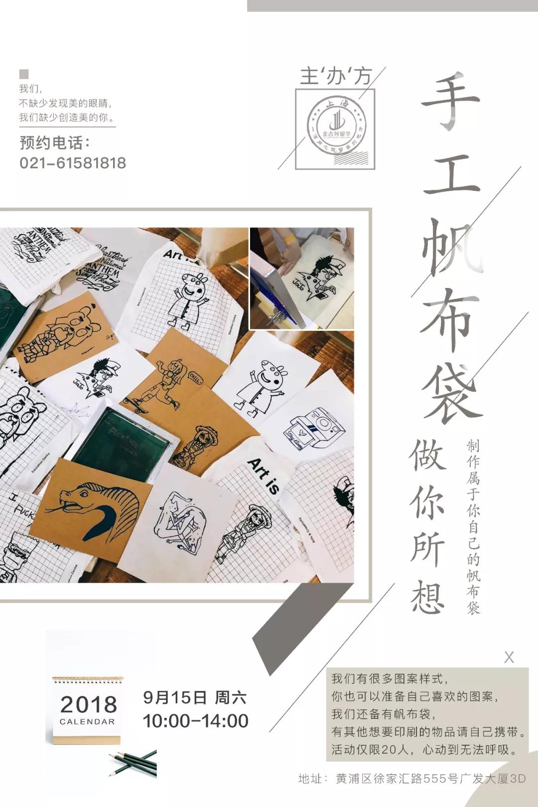 我们有很多图案样式,你也可以准备自己喜欢的图案。制作属于你自己的帆布袋,就在明天哦。2018年9月15号上午9:45开始哦。
