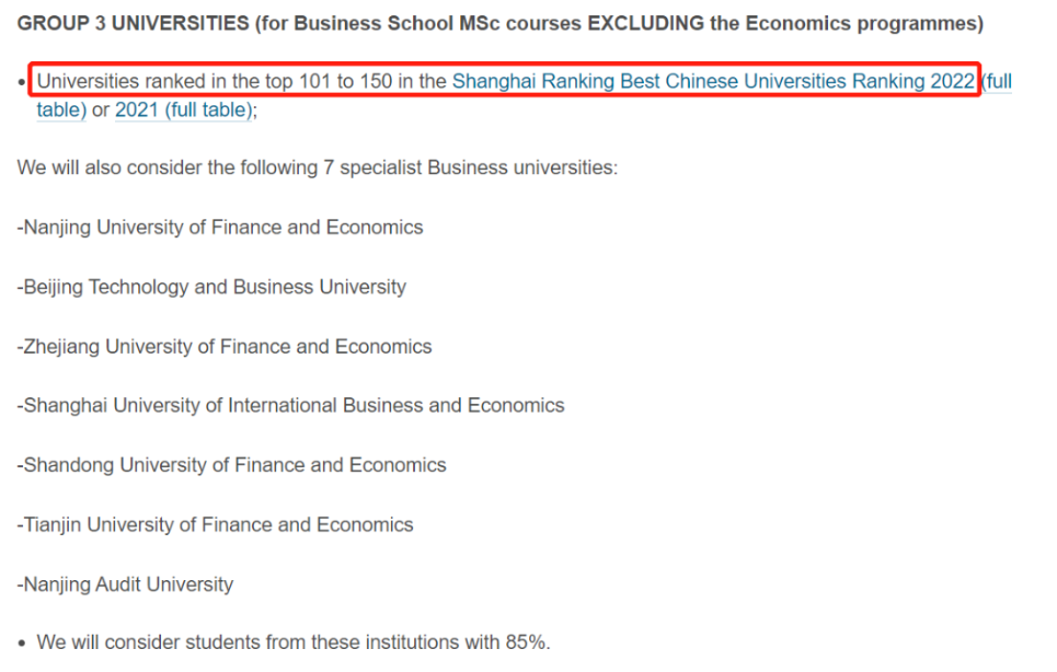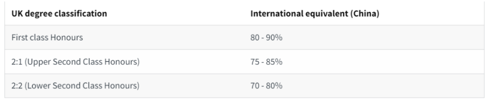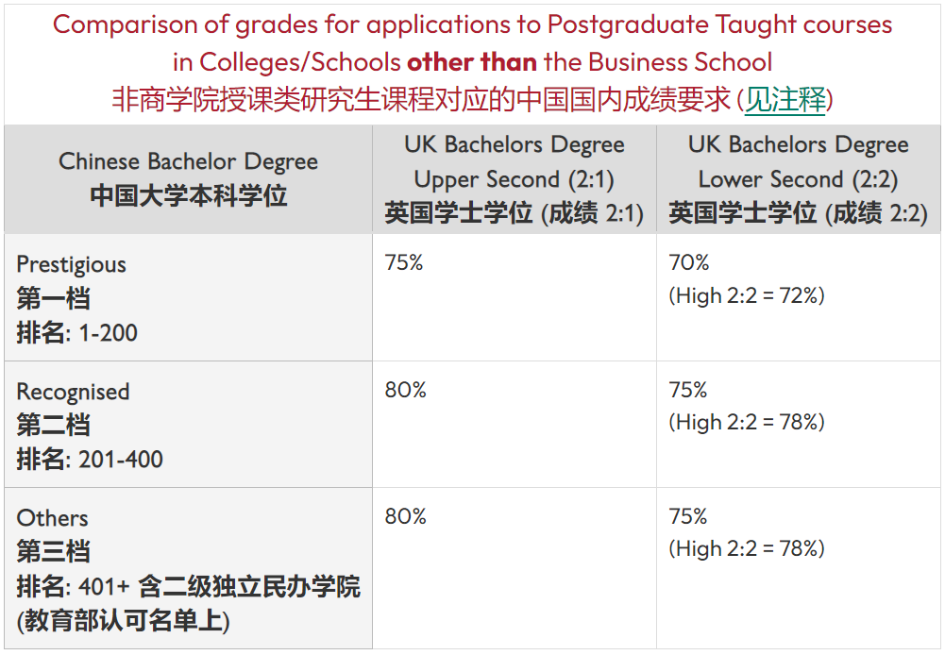 在申请国外院校的研究生时,学校对于申请者的本科院校背景也会有明确的要求,不同等级的院校要求的申请分数不同。英国大学一般会参考软科排名或Netbig(网大排名)划分档次,对来自不同档次院校申请者的GPA均分要求不同,排名靠前均分要求更低。