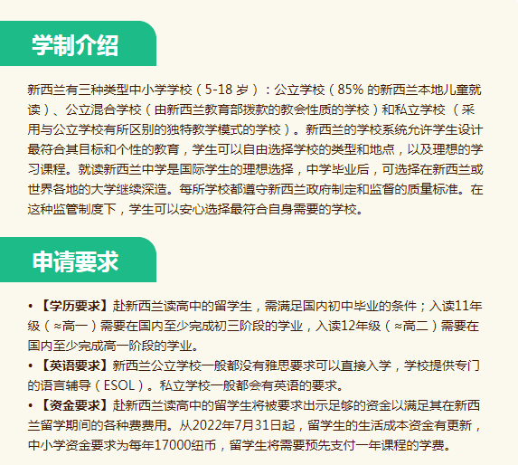 - 极高的留学性价比:新西兰中学费和生活费每年仅需15万,公认的性价比最高的留学国家;