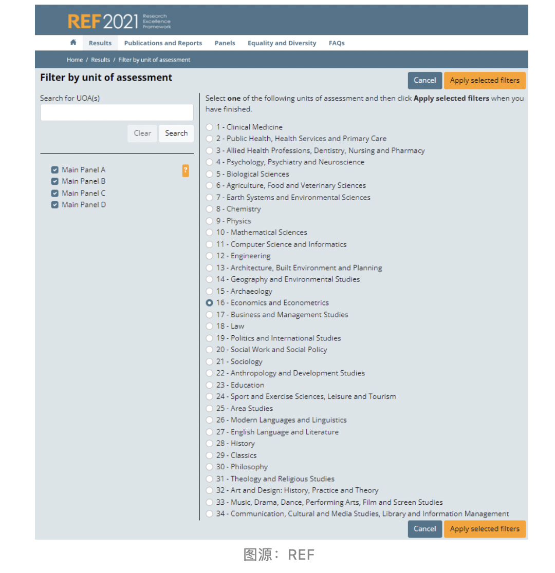 除了整体评价结果外,我们还可以在REF中找到 34个学科的评估单元(UoAs) ,代表着英国大学在这34个学科领域各自的学术表现。