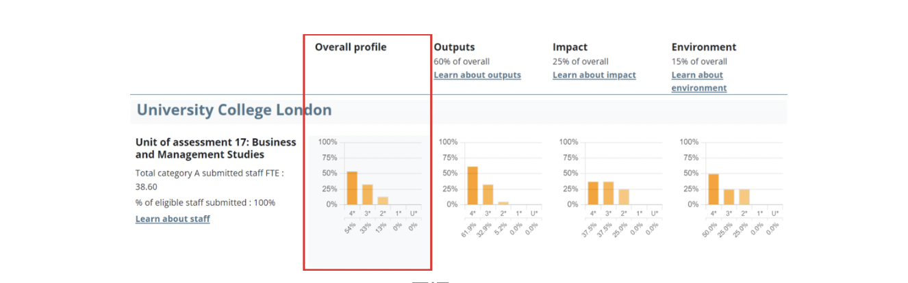 以下面的 伦敦大学学院“商业与管理”学科 举例,(三要素综合) 54%的学术成果被评为4(世界顶尖), 33%被评为3(国际优秀) 。