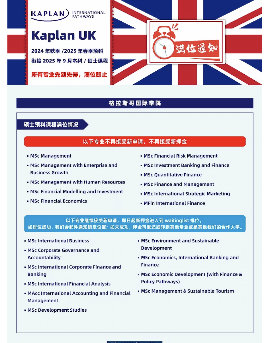 格拉斯哥大学 24FALl 硕士预科满位通知如下: