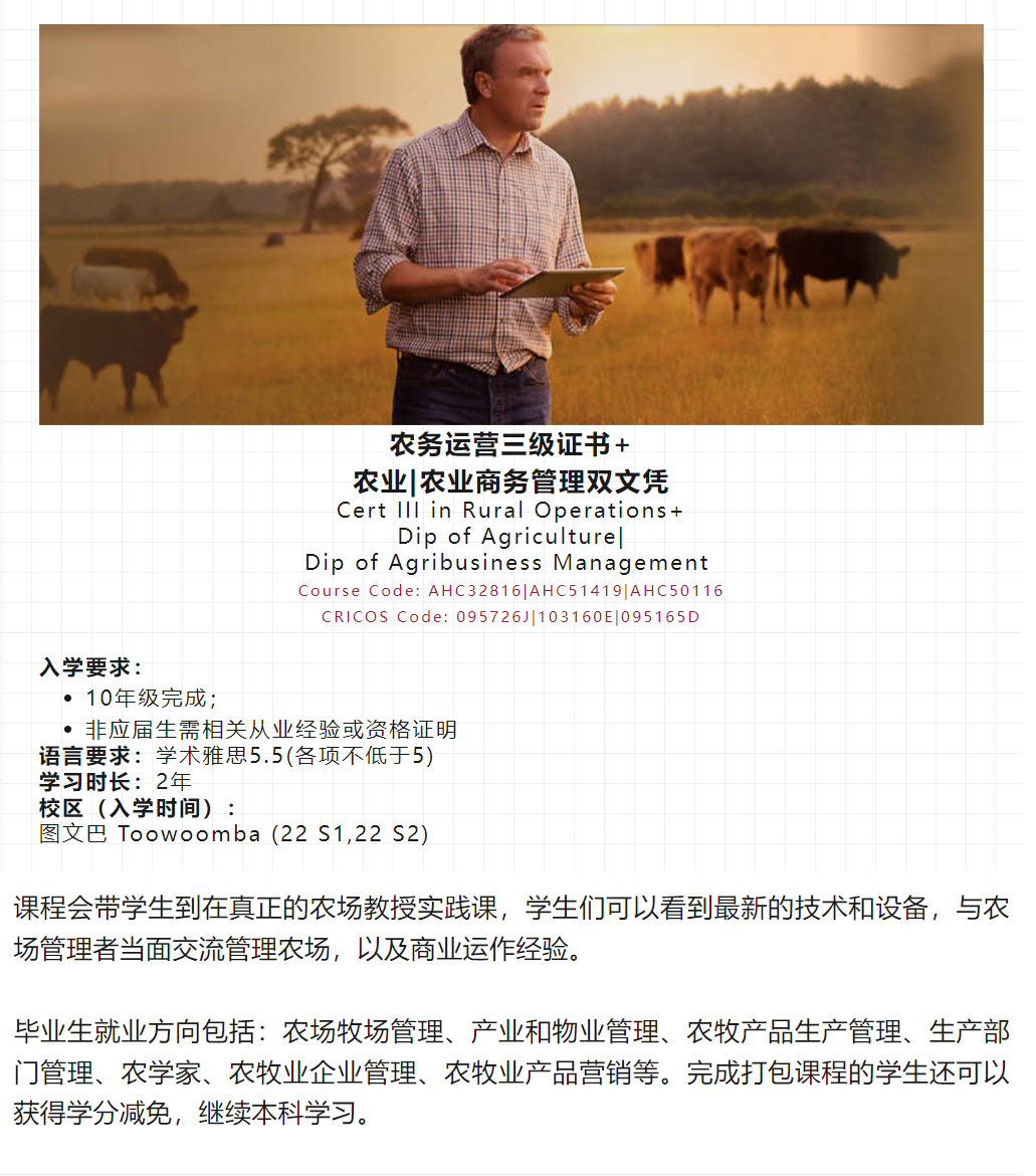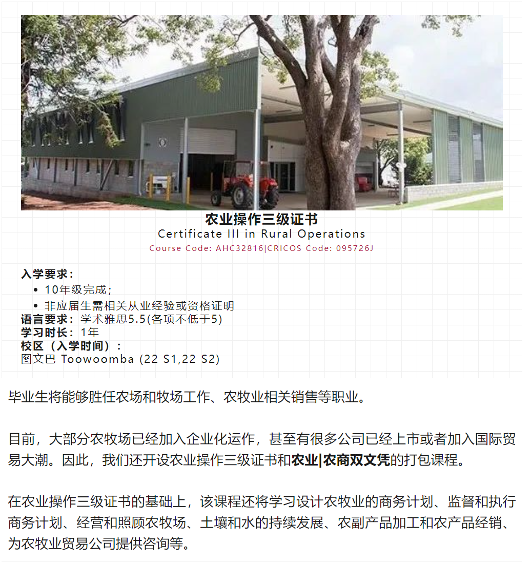 TAFE Queensland 在Toowoomba校区向国际学生开放了农业操作、农业、农业商务课程。此校区地处 Darling Downs,距离布里斯班仅1.5小时车程。并且邻近 Lockyer Valley,农产品加工、销售、农贸进出口公司繁多,是澳大利亚农业的主要贡献区域之一。
