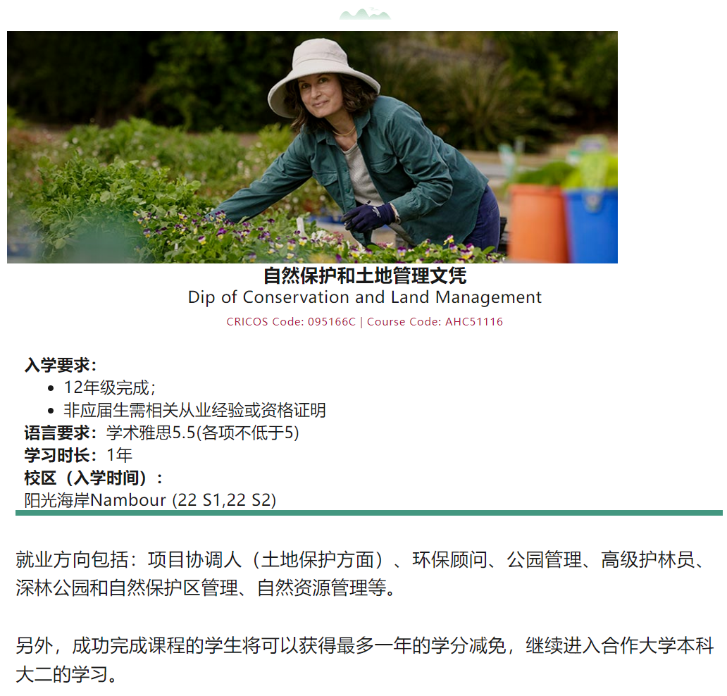 TAFE Queensland 向国际学生开放自然保护和土地管理文凭,该课程学生将从学习植被管理、植物分类、生物调查、害虫管理开始,进一步掌握有效管理自然资源、维持土地可持续发展的高级技能。