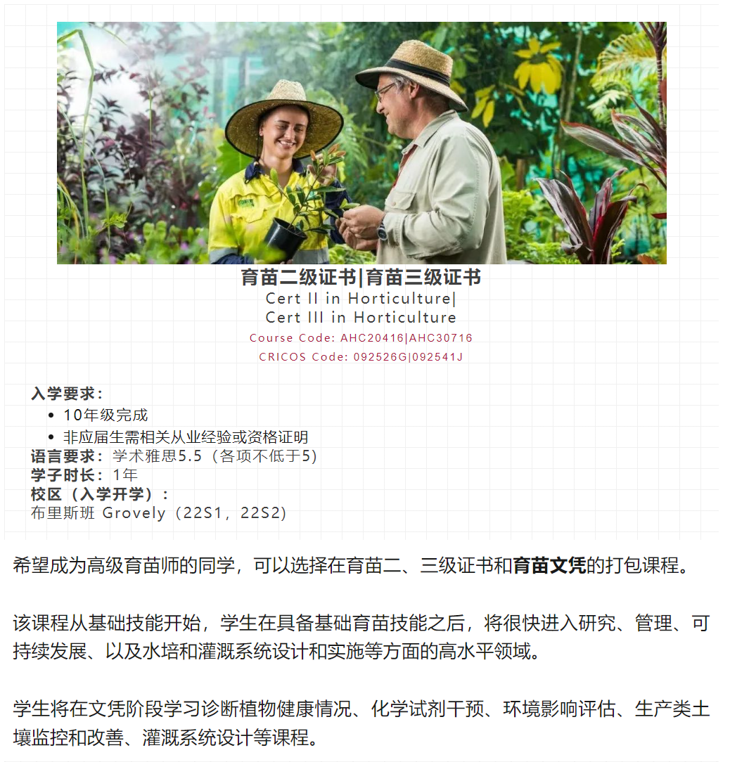 TAFE Queensland 提供育苗、园艺、园林设计课程;从基础技术入门,学生将能够胜任园林设计、宏观培育、园林植被管理等工作。