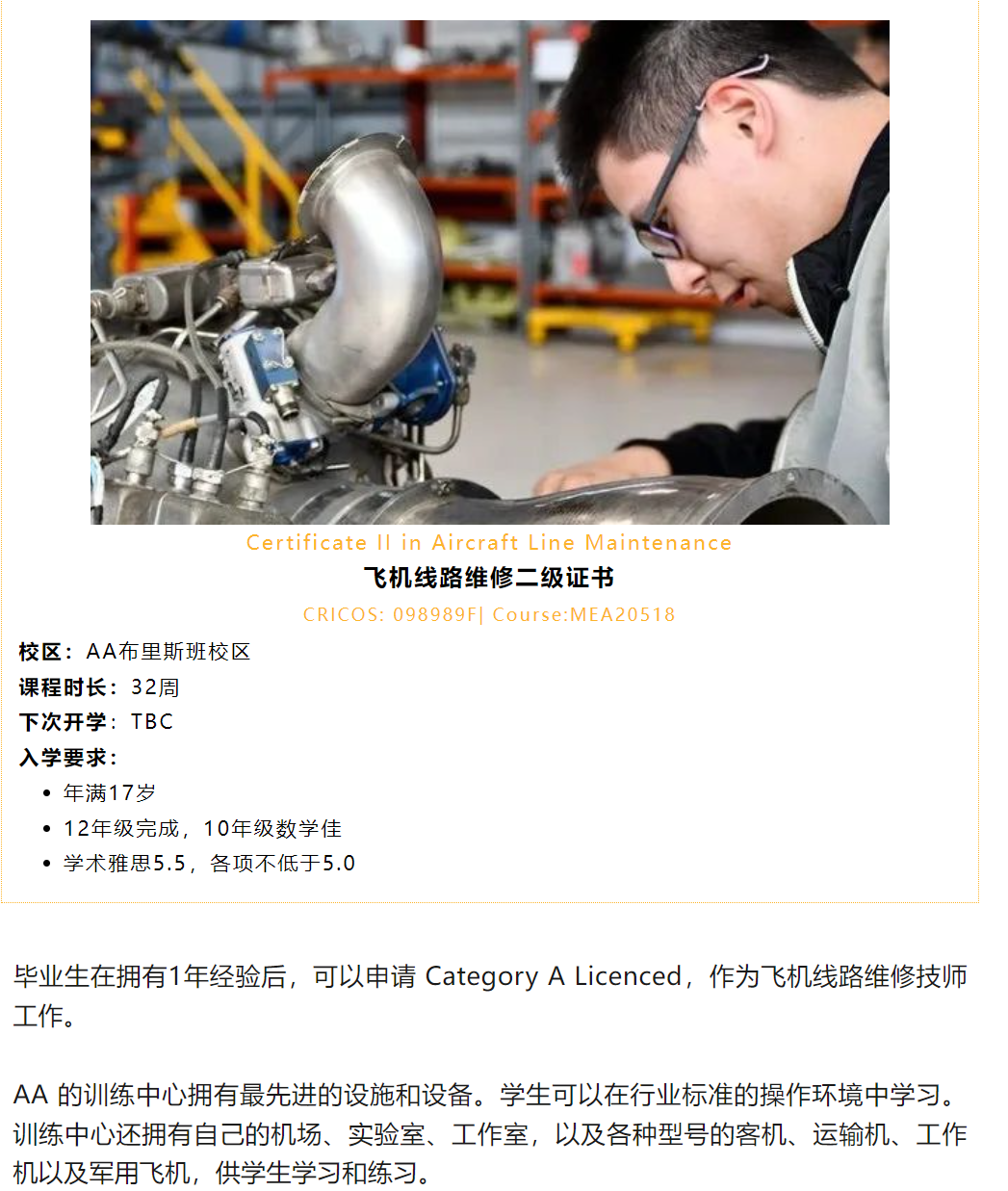 万米高空,保证旅客安全一定是发展航空事业的重中之重。TAFE Queensland 和 Aviation Australia (AA, RTO30770| CRICOS 02425C) 联合推出飞机维修相关课程,专注飞机的安全检查和维护,助力每一次安全航行。