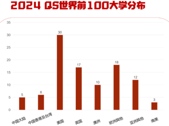 在世界大学前100的高校占比中,美国高校上榜30所,英国高校上榜17所,澳洲高校上榜10所,中国大陆高校上榜5所,中国香港及台湾高校上榜6所。