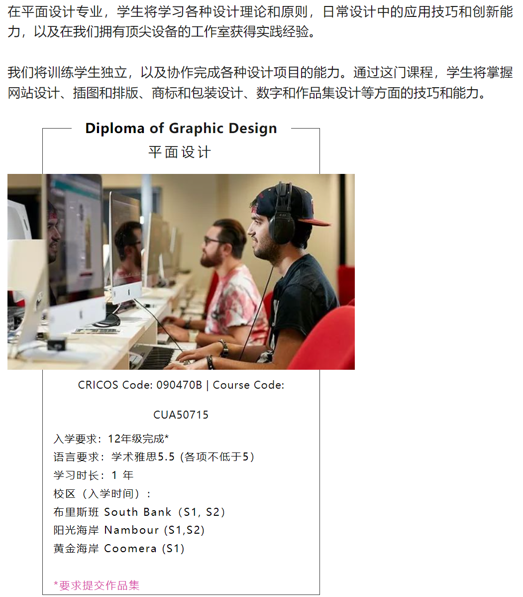 在 TAFE Queensland,我们的平面设计工作室配备了最新的行业标准软件,包括完整的Adobe Photoshop、Illustrator、InDesign 和 Dreamweaver等。 学生可以在商业级别的工作室学习和实践,并且有机会到专业的设计工作室参观学习,接触行业精英。