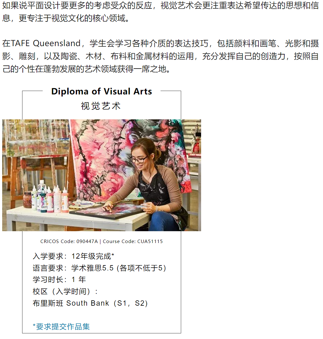 视觉艺术是一门广阔的艺术,学生在毕业后可以选择继续加深艺术造诣,获得学分减免进入本科的学习。
