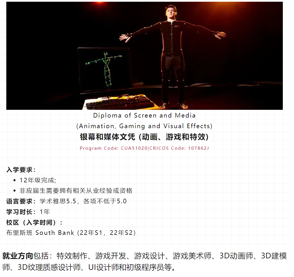 该课程拥有四个分支,包括:动画、游戏和特效,导演,后期制作,以及制片。学生将根据所选分支学习专业的技能和技巧。