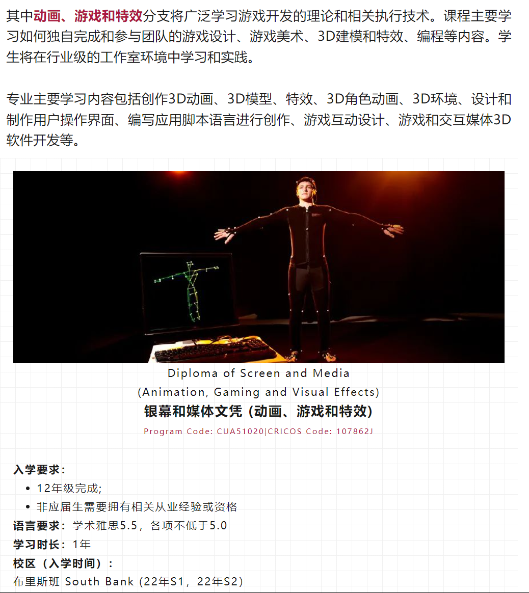 该课程拥有四个分支,包括:动画、游戏和特效,导演,后期制作,以及制片。学生将根据所选分支学习专业的技能和技巧。