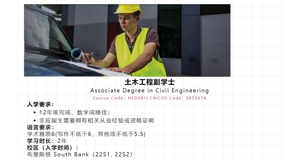 TAFE Qeensland 开设 土木工程副学士 课程,学生将主要学习土木和结构工程的各种理论和应用技术。