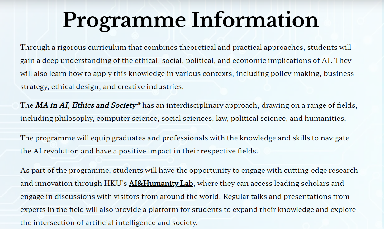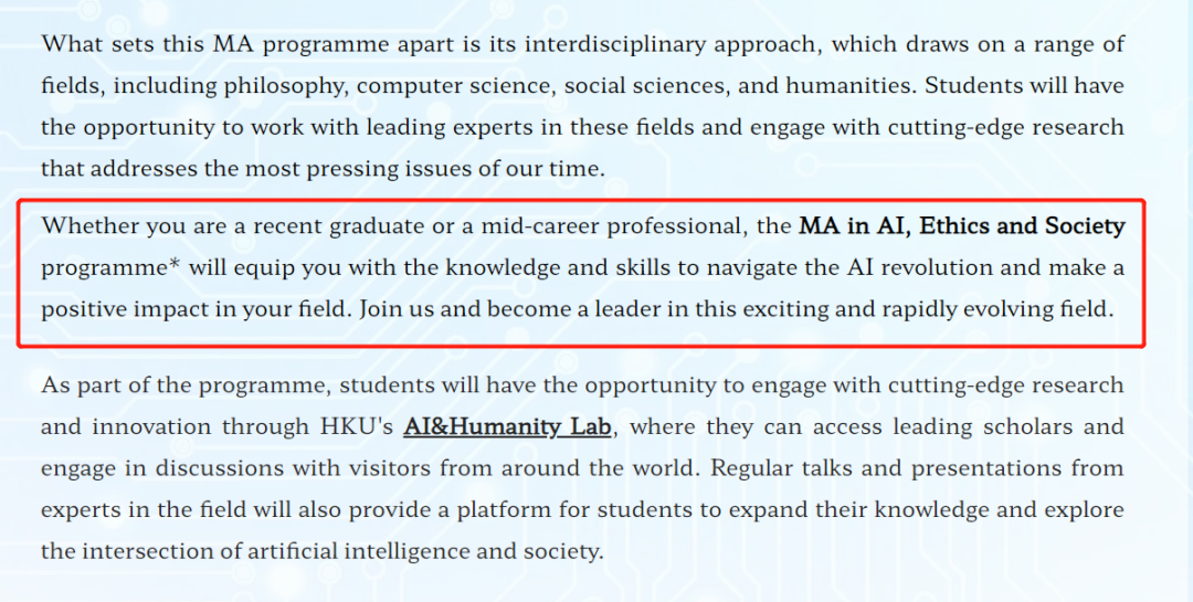 香港大学 还是没有放弃23Fall的学生!最近,港大突然在 文学院 下面新增了一个 人工智能、伦理和社会 专业。