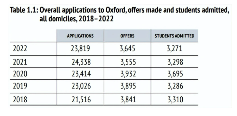 2022入学,牛津本科录取人数为3,271人,与疫情前水平基本一致。申请数量略有下降,但仍高于疫情前水平。一共23,819人递交申请,3,645人获得offer,3,271人获得最终录取。