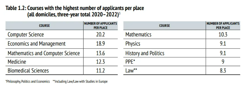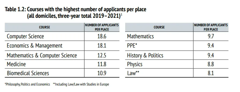 从录取比例来看,2020-2022近三年牛津本科十大热门申请专业包括:计算机科学、经管、数学与计算机、医学、生物医学科学、数学、物理、历史与政治、PPE、法律。