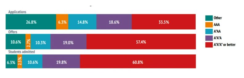 超66.9%的申请者与约91.2%获得录取的学生成绩都达到AAA或以上。录取学生中60.8%的人成绩达到AAA或以上。(去年是68.1%)