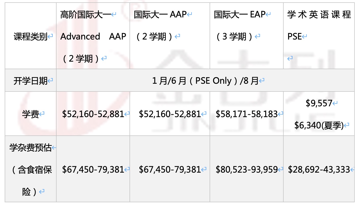 学术英语课程 PSE $9,557 ( 14 周) $6,340( 夏季 ) 。