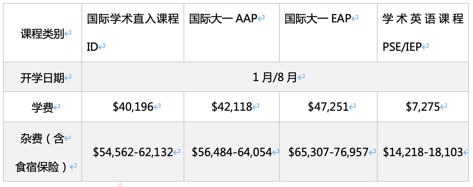 本科提供国际学术直入课程( ID )、国际大一课程( AAP&EAP )和学术英语课程 (PSE/IEP) 。
