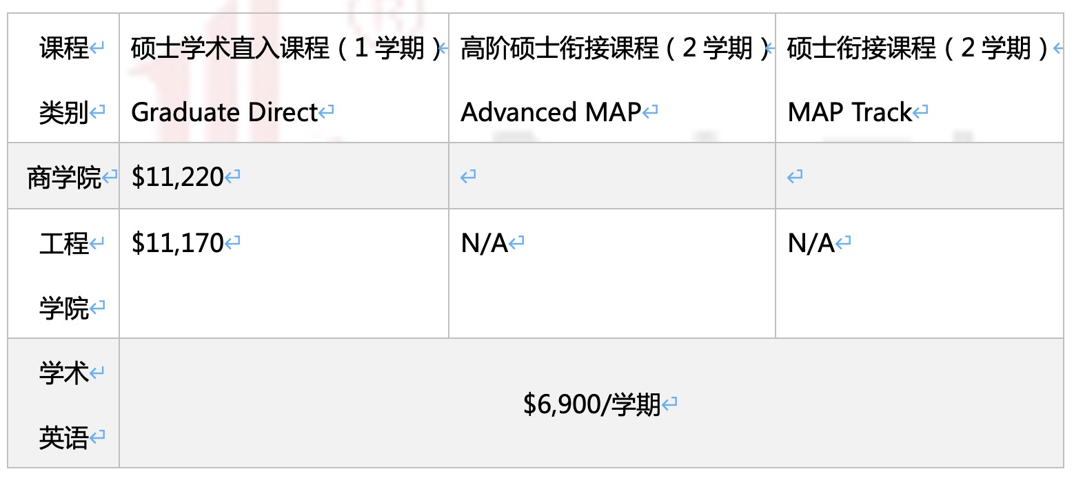 硕士提供硕士学术直入课程( Direct )、硕士衔接课程( MAP Track & Advanced MAP )和学术英语课程 (PSE/IEP) 。