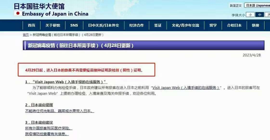 日本使馆也同时通知: 4月29日起,入境不再需要疫苗接种证明及核酸阴性证明。