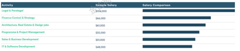 香港城市大学毕业的毕业生,收入最高的行业是法律&律师助理,年薪104,000美元;其次是财务控制与战略,年薪66,000美元;建筑、房地产和设计工作,年薪61,000美元;计划与项目管理,年薪55,000美元;销售和业务发展,年薪51,000美元;IT&软件开发,年薪48,000美元。